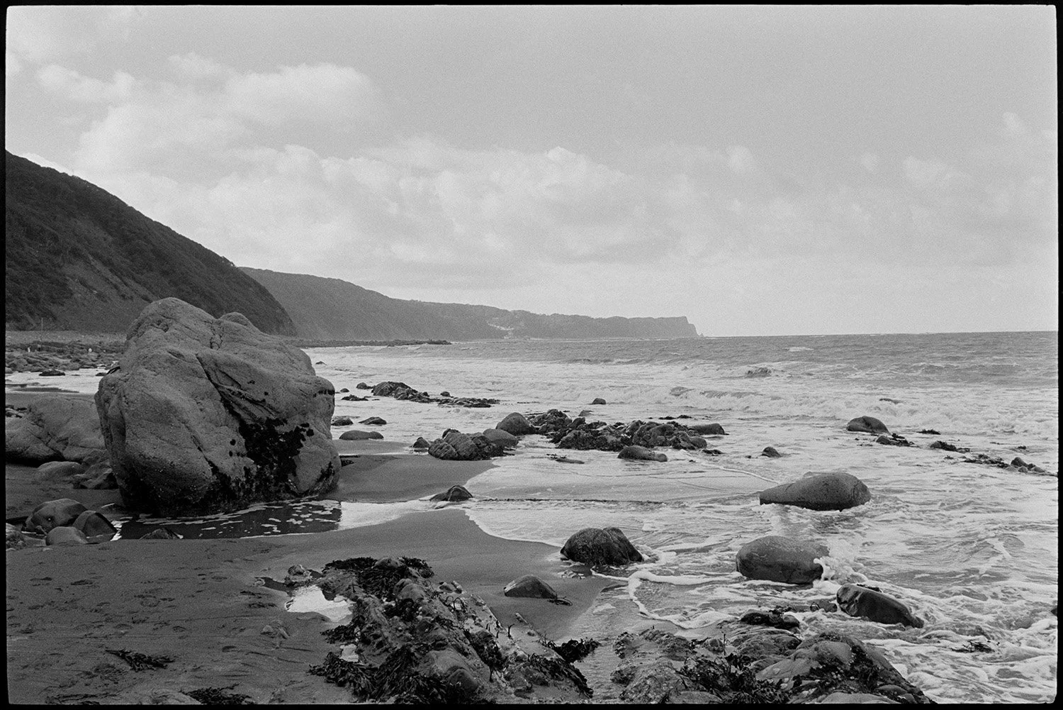 Holidaymakers on a rocky shore in thick sea mist. Photograph by James Ravilious © Beaford Arts digitally scanned from a Beaford Archive negative.